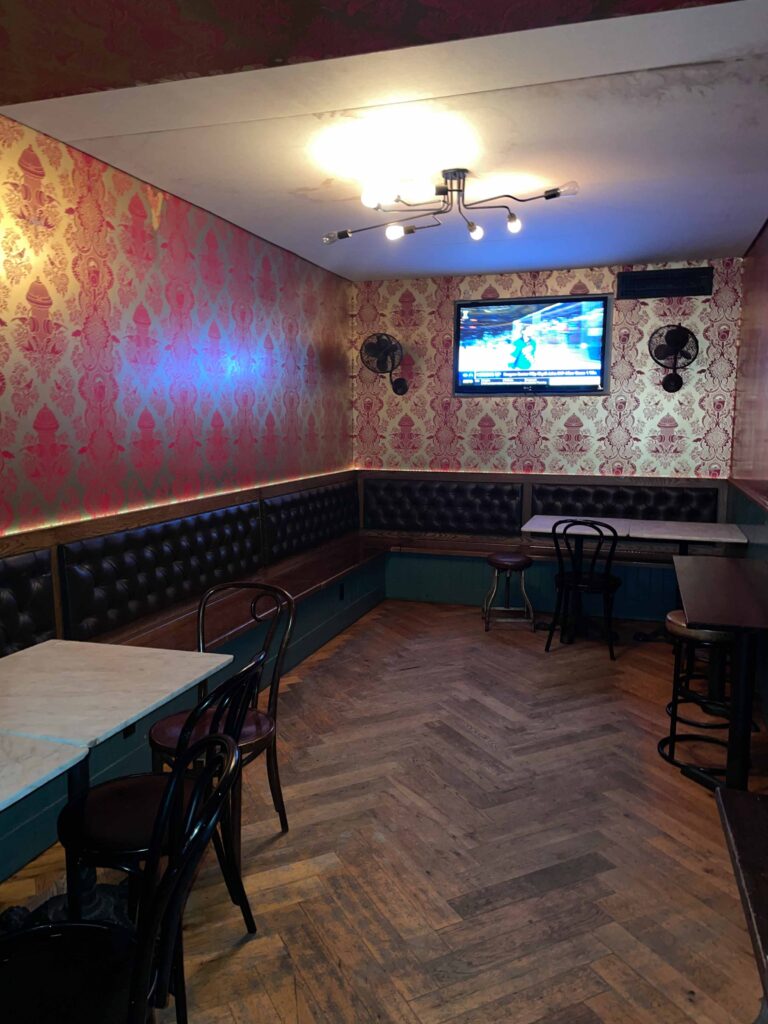 Dark wood furnishings, comfortable seating, and warm lighting establish the cozy ambiance of a classic London pub, while modern touches reflect our East Village location. The bar area serves as the focal point, showcasing our impressive gin collection and creating a natural gathering space for conversation. Throughout the venue, subtle nods to British culture – from artwork to design details – reinforce the authentic pub experience.